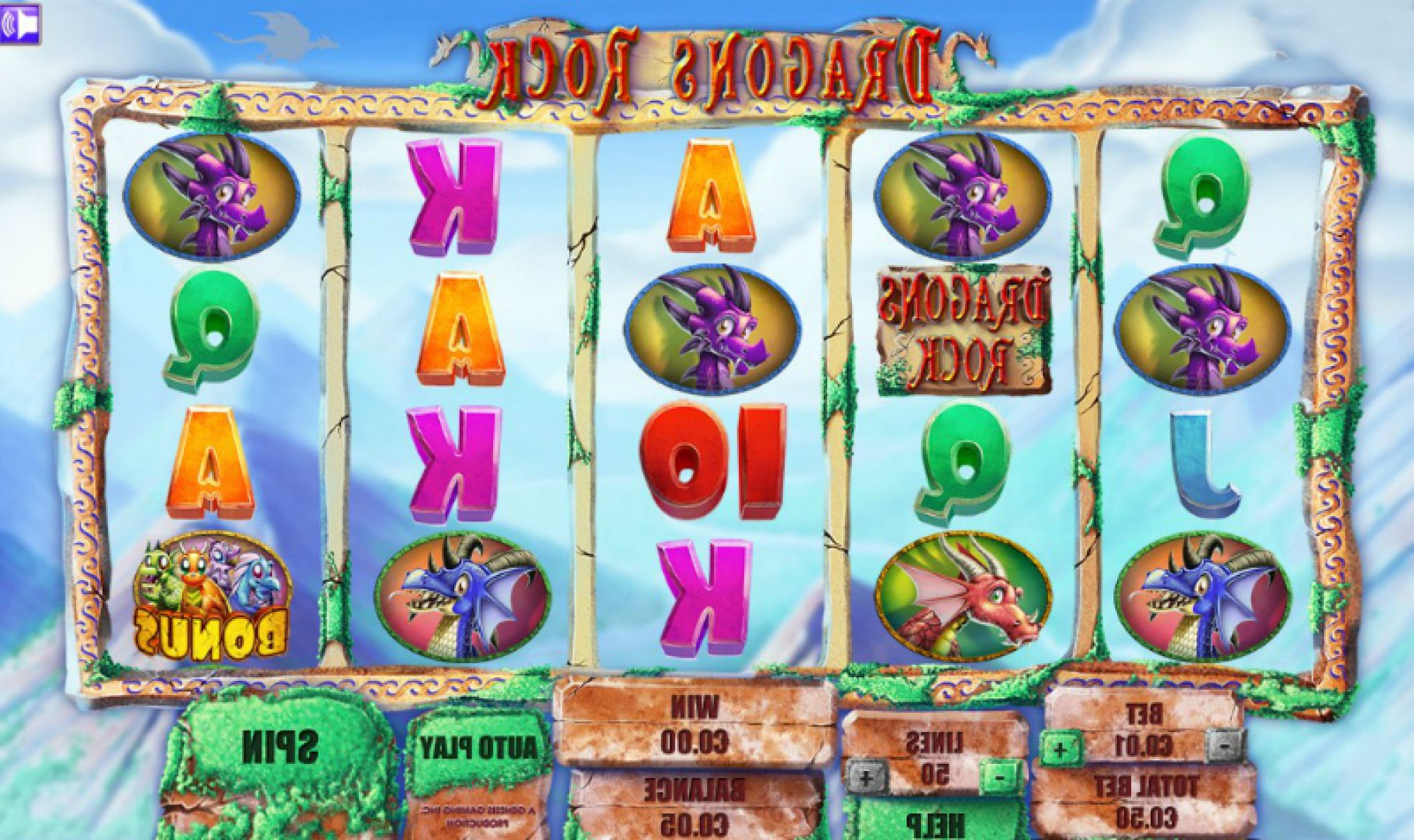 Albeit modest cash rewards. The list of basic symbols you can encounter during the game Dragon Rocks is half classic and half adorable. The first half contains the usual card symbols, ranging from number 10 to the Ace. You have four different baby dragons to choose from, each cuter than the last, as well as the game logo. Five-of-a-kind combinations of all these symbols can award a prize at least 500 times greater than your initial bet.
